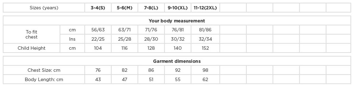 | Chest (to fit) | 22/25 | 25/28 | 28/30 | 30/32 | 32/34 |